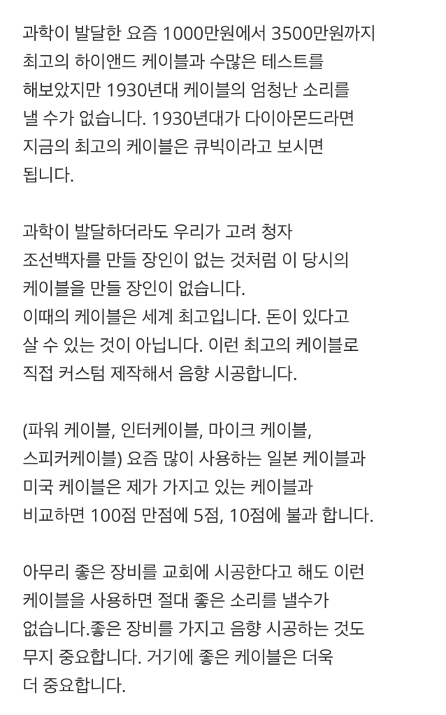 그 업체가 시공한 교회에서 음향이 문제가 되어 재시공한 음향 업체 관계자의 이야기를 들어보니 독일 노이만사의 빈티지 케이블로 시공했다고 하는데, 그 케이블을 까 보니 일반 전선에 외피만 래핑한 것이었습니다. 게다가 케이블 시공도 엉터리로 해 놓았습니다. 이렇게 과거의 빈티지 케이블로 시공을 한다고 합니다. 그의 주장대로 이렇게 오래된 케이블은 산화가 되어 케이블로서의 정상 성능을 낼 수 없습니다. (HiFi 음향에서도 기기는 오래 된 것을 사용하더라도 케이블은 최신 제품을 써서 신호 손실을 최소화 합니다.) 근자에는 케이블에 한글로 “국산 카나레 케이블”이라고 인쇄해 시공하는 말도 안되는 짓을 하고 있습니다. 오리지널 Canare 케이블 외에 한글로 그것도 “국산”이라고, 또 한글로 “카나레”라고 만들지 않습니다.