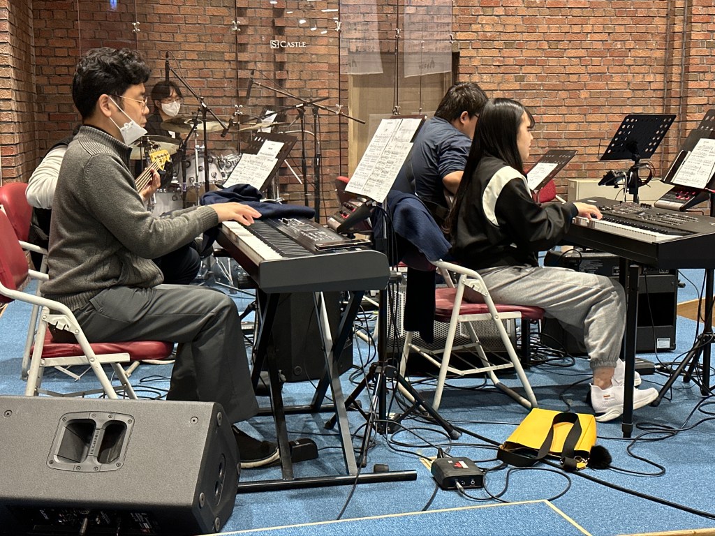 효과적인 세팅을 위해 튜닝 이후 오후시간에 찬양팀이 다 나와 보컬과 각 악기별로 각각의 소리를 세팅을 하고 합주 연주를 하여 전체 밸런스와 사운드를 만들어 냅니다.