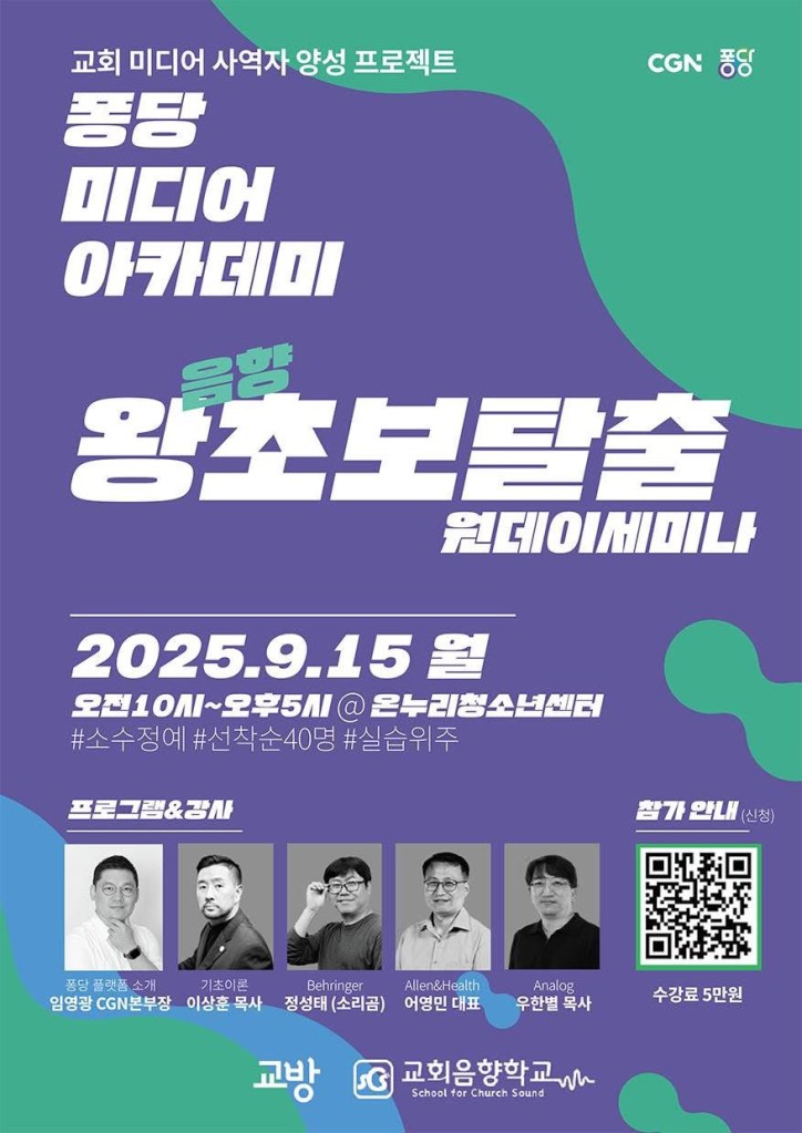 교회음향학교와 교방닷컴이 공동 기획하는 왕초보탈출 원데이세미나가 열립니다. 이번 세미나는 CGN과 함께하며 그동안의 경험들을 살려 실제 교회방송실에 도움이 되는 내용으로 준비했습니다.