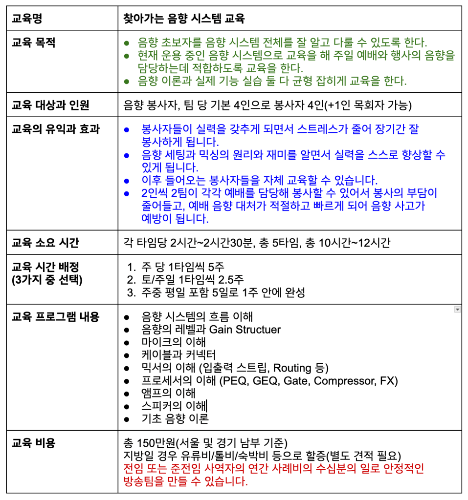 현재 사용하시는 귀 교회의 음향 시스템으로 가르쳐 드리며, 따라서 맞춤 교육을 위해 상담 시 미리 귀 교회의 음향 시스템에 관한 정보와 사진을 제출해 주셔야 합니다.