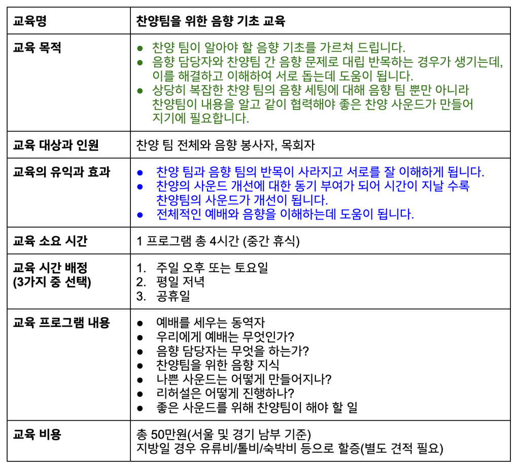 가끔 수입 회사에서 일회성 교육이 있지만, 우리 교회에 맞는 전반적인 음향 교육이 아니라, 특정 제품의 사용법 교육이라 배우고 와도 교회에서 적용을 하기가 어려웠을 것입니다.