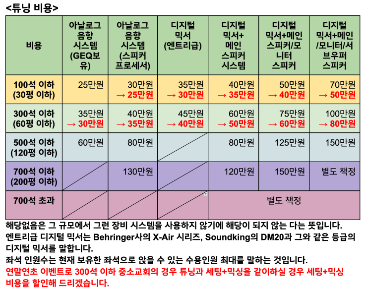 음향 시스템을 계속 사용하다보면 사운드가 나빠져 튜닝이 필요한 중소교회를 위해 튜닝 비용을 할인해 드리게 되었습니다.