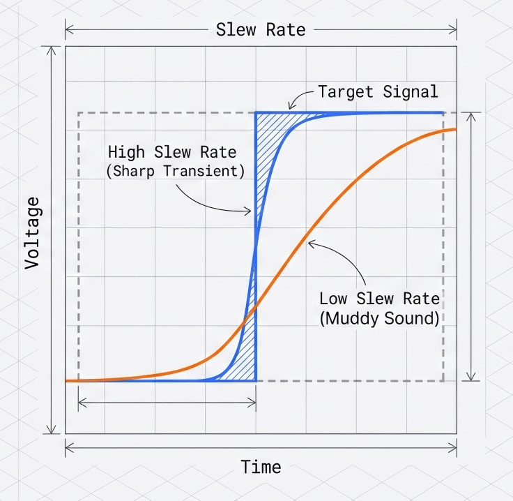 - Slew Rate (슬루 레이트): 입력 신호가 급격히 변할 때 전압이 얼마나 빨리 반응하느냐의 수치입니다. 이 수치가 높을수록 드럼의 타격감이나 고음역대의 해상도가 뭉개지지 않고 선명하게 들립니다.