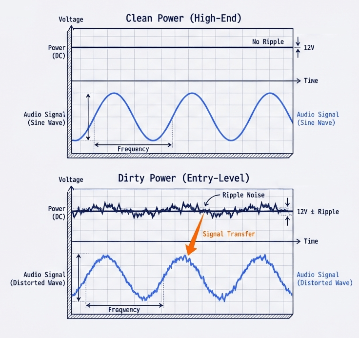 현대 디지털 믹서는 국제적 전압 호환성과 효율성을 위해 주로 SMPS를 사용합니다. SMPS는 50kHz에서 1MHz에 이르는 고주파 스위칭을 수행하며, 이 과정에서 발생하는 고주파 리플(Ripple)과 전자기 간섭(EMI)은 오디오 회로의 배경 소음을 높이는 주원인이 됩니다. 전원 설계가 부실한 경우, 신호가 없을 때도 미세한 고주파 히스(Hiss) 소리가 들리거나 연주 시 믹스의 다이내믹이 답답하게 느껴지는 결과를 초래합니다.