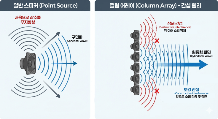 일반적인 스피커(포인트 소스)와 컬럼 어레이 스피커의 가장 큰 차이점은 소리가 퍼져나가는 형태, 즉 파면(Wavefront)의 차이입니다.